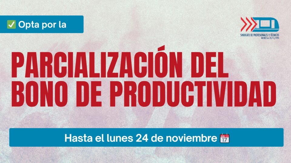 Les informamos que, según lo indicado en la Cláusula 11 del Convenio Colectivo vigente (2024-2027), podrán optar a la parcialización de su Bono de Productividad. Esto básicamente significa mensualizar, de forma anticipada, un 10% de su sueldo base.